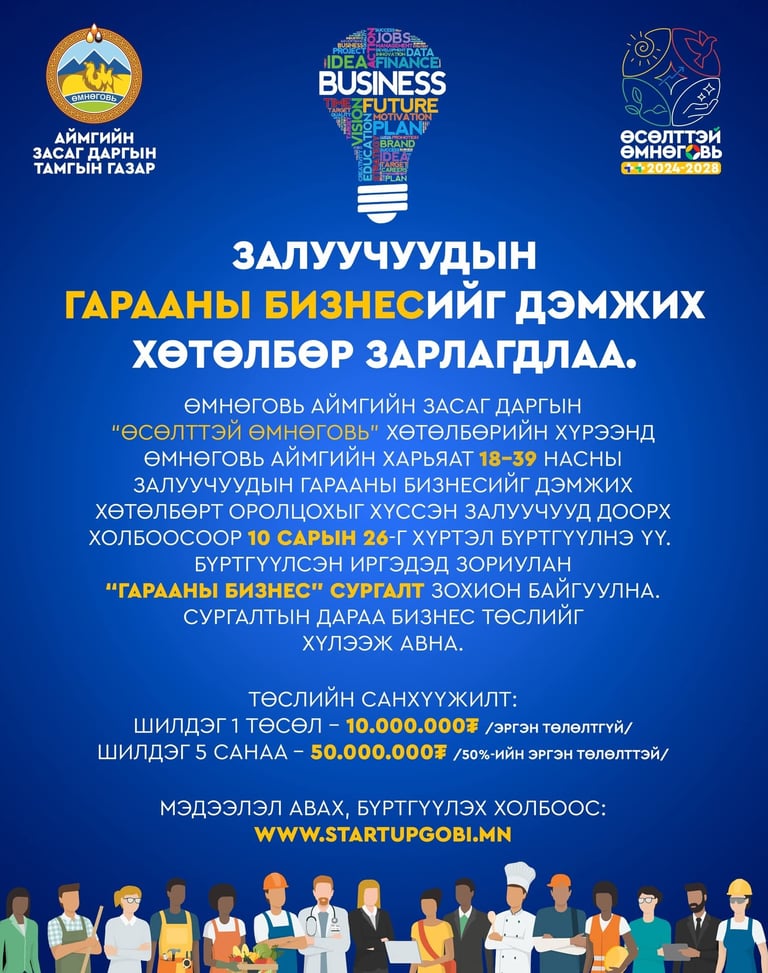 “Өсөлттэй Өмнөговь” хөтөлбөрийн хүрээнд “Залуусын гарааны бизнесийг дэмжих” хөтөлбөр зарлаж байна. Хөтөлбөрийн хүрээнд олон залууст бизнесээ эхлүүлэх, өргөжүүлэх боломжийг олгодог.